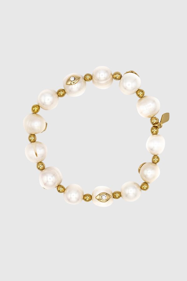 Perfect for wearing solo or stacked along with your other faves, this playful yet polished bracelet is strung with a mix of gold-tone beads and celestial-embossed pearls.
