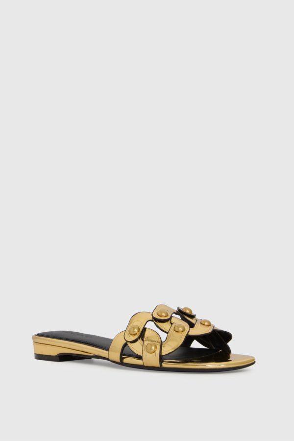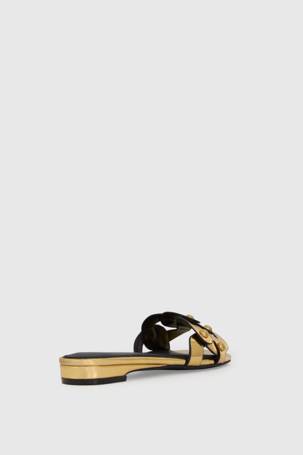 Step out in style with your new favorite sandal. This bold flat features a woven link upper with dome stud details and a soft square toe for a modern edge. A padded insole and flexible rubber sole offer all-day comfort and traction.