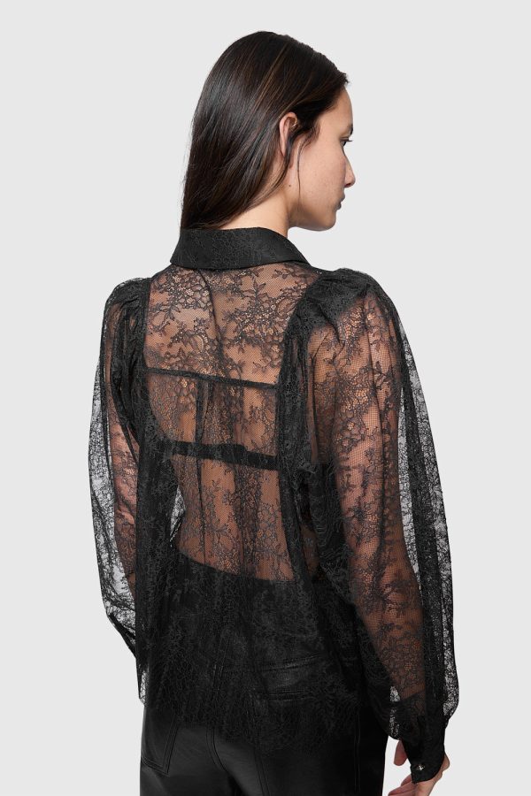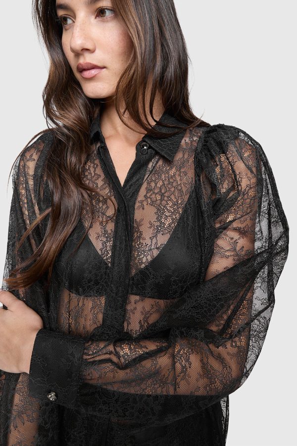 The Cleo Lace Sleeve Shirt exudes romantic allure with its sheer lace design and classic button-front opening. Crystal shank buttons on the cuffs add a touch of sparkle, making this blouse a perfect blend of timeless elegance and modern sophistication.