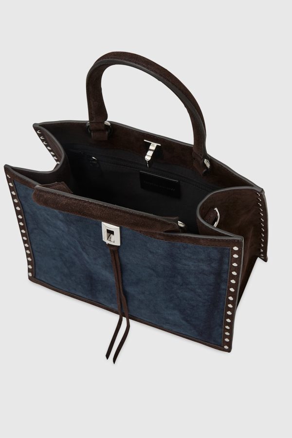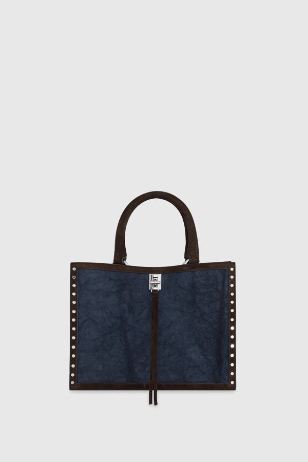She’s the smaller version of our spacious Darren Tote. Made from denim and suede and punctuated with dainty studs along the sides. She’s perfect for day-to-day city adventures.