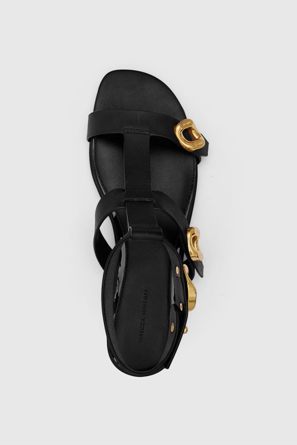 The G City Sandal transforms the gladiator silhouette with sleek calf leather and signature Rebecca Minkoff curb link buckles. A cushioned insole and barrel heel offer comfort and sophistication in equal measure.