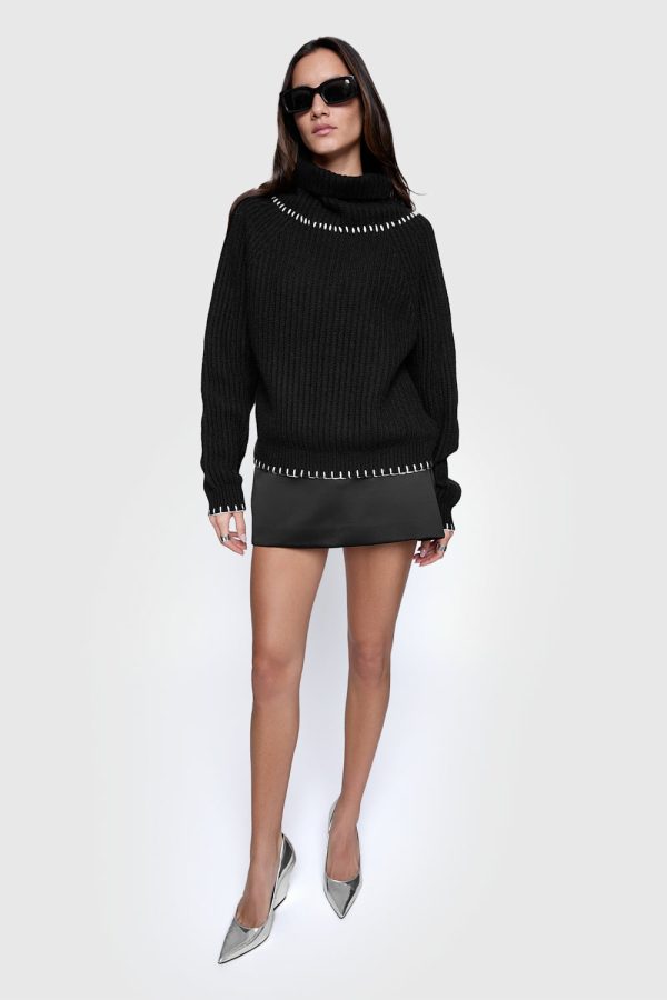 The Harlow Stitch Sweater offers a super cozy wool knit with a stylish funnel neck, perfect for cooler days. Its contrast white whipstitch detailing adds a sophisticated edge to a classic look.