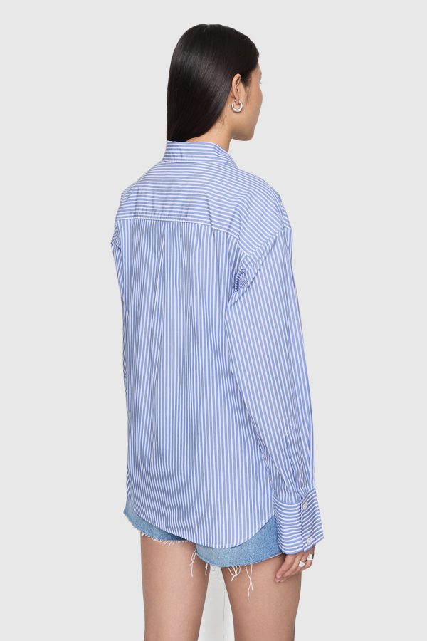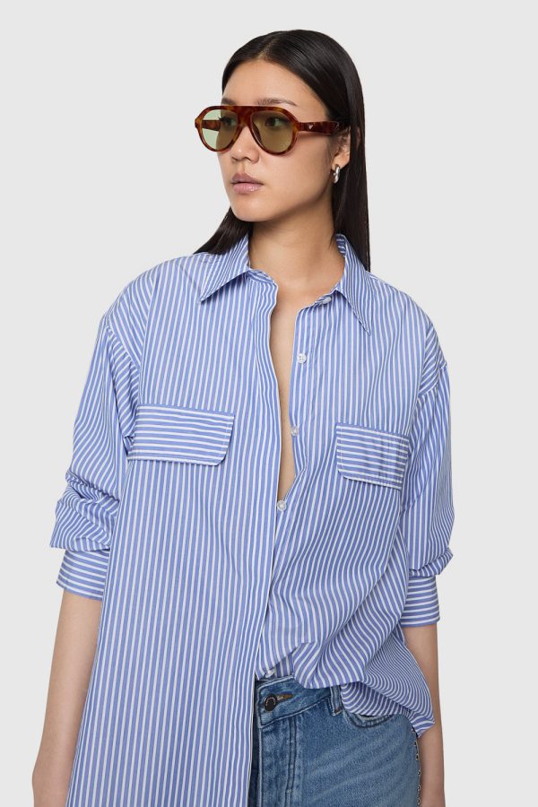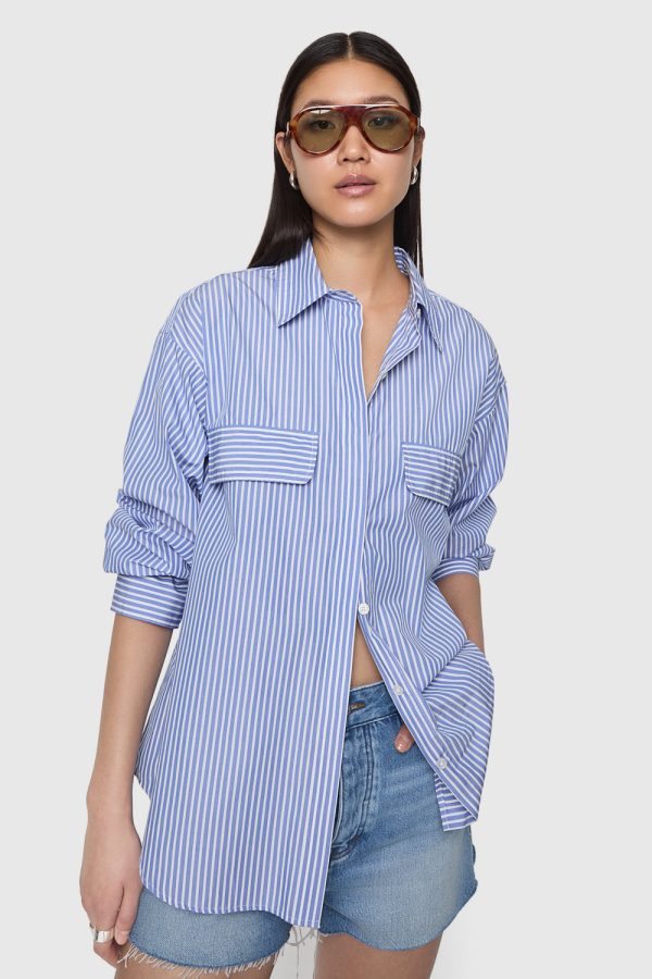 The Skylar Button-Down is a crisp, long-sleeve striped shirt with a classic button-front design and collared neckline. Flap pockets at the front add a touch of utility, making it both timeless and practical.