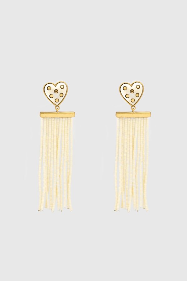 These lightweight earrings are strung with dainty cream-colored beads that are anchored by studded heart pendants.
